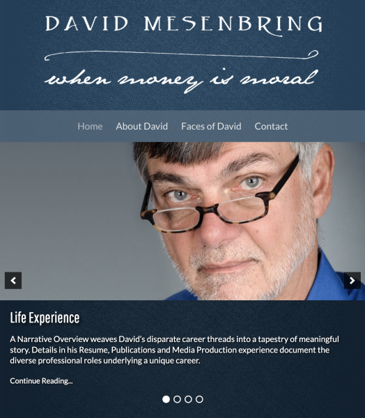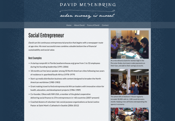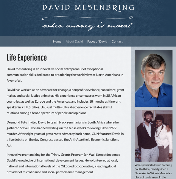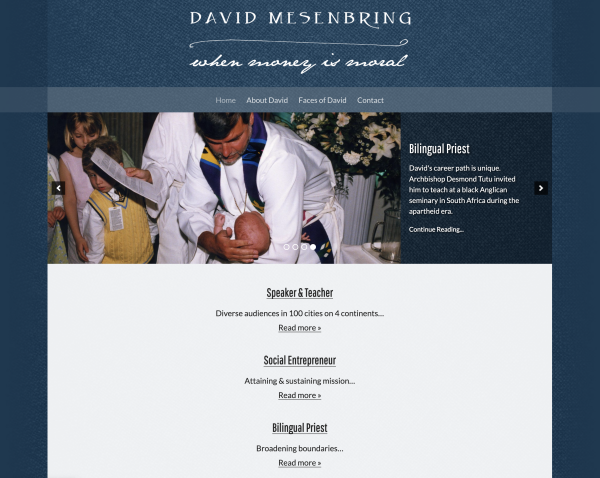 Built for David Mesenbring—author, nonprofit leader, and Episcopal priest—this site was migrated from Drupal 7 to WordPress to simplify content management and expand portability. I created a new design and WordPress theme while preserving key content and visual identity.